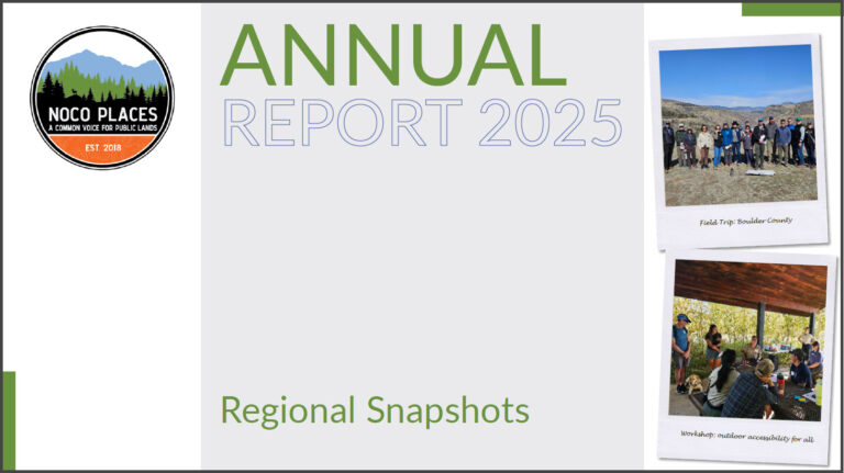 NoCo Places is a partnership of nine county, state, and federal public land agencies working together across north-central Colorado. As visitation to the region’s mountains and foothills continues to grow, these agencies collaborate to address the shared challenges of recreation management, resource protection, and visitor safety. By coordinating across jurisdictions, NoCo Places helps develop sustainable solutions that protect public lands while supporting high-quality outdoor experiences for the people and communities who rely on them.